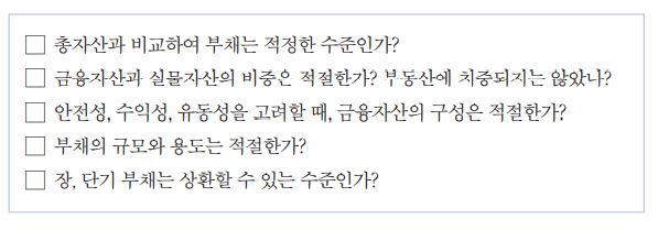 자산부채상태표를 통해 재무상태가 얼마나 안정적인지, 어느 한 종류의 자산에 편중되어 있는 것은 아닌지, 부채의 목적은 무엇이며 장단기 부채의 분배는 어떠한 지 등을 파악할 수 있습니다. 다음 사항을 체크해 보세요.
