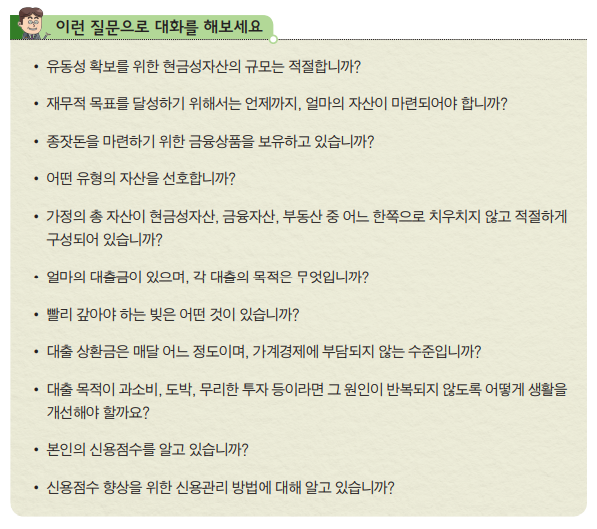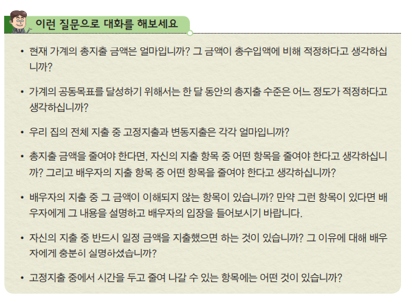 부부가 궁극적으로는 ‘한 가족으로서 함께하는 경제생활’을 만들기 위해서는 실 질적인 공동의 목표를 세우고 실천해 나가는 노력이 필요합니다. 구체적으로 소비 지출 현황을 비롯하여 자산을 형성하고 늘리는 데 필요한 부채 및 자산 현황 등 공 동의 목표를 위해 부부가 함께 대화하고 이해해야 하는 주요 핵심 내용이 있습니 다. 다음을 참고하여 부부가 함께하는 ‘우리의 경제생활’ 모습을 찾도록 해보세요.