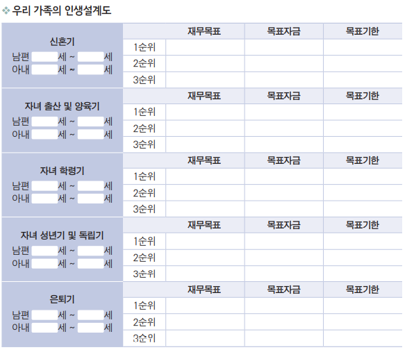 신혼부부가 가장 많이 하는 대화 중 하나는 “아이는 낳을까?”, “낳는다면 몇이나, 언제쯤 낳을까?”, “집은 언제 마련할 수 있을까?” 등일 것입니다. 이러한 대화가 ‘우 리가족 인생설계 그려보기’의 시작입니다. ‘우리가족 인생설계 그려보기’는 전체적 인 밑그림을 그리는 과정으로 앞으로의 가족 목표들을 전체적으로 설계해 보는 과정입니다. 이러한 인생설계도는 부부가 가지고 있는 가치, 태도, 신념 등에 영향을 받으며 한번에 이루어지는 것이 아니라 일생을 통해 지속적으로 해야 하는 과정입니다.