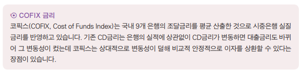 대출 금리는 크게 변동형, 고정형, 혼합형으로 구분할 수 있습니다. 결론을 먼저 말씀드리면 금리 상승기에는 고정금리가, 금리 하락기에는 변동금리가 유리합니다. •변동형: 금융시장의 단기금리 지표인 CD, COFIX 금리 등을 기준으로 3개월, 6개 월 등을 주기로 금리가 변경되는 유형입니다. 시장의 금리변동 위험을 소비자가 주로 부담하는 구조로, 대체로 고정금리 대출에 비해 낮은 금리를 적용합니다. •고정형: 대출시점에서 결정된 금리가 대출만기까지 똑같이 적용되는 유형입니 다. 금리변동이 없어 안정적으로 부채를 관리할 수 있다는 것이 장점입니다.