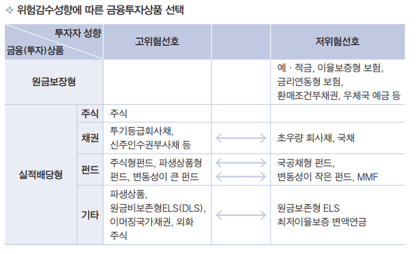 금융자산은 단순 수익률보다 이자 소득세와 물가상승률 등을 감안한 실질 수익률 관리가 중요합니다. 통상 은퇴자산을 안정적으로 운영하기 위해 원 리금보장상품에 예치하는 경우가 많은데 최근과 같이 저금리 기조가 계속되 는 상황에서는 펀드와 같은 실적배당상품 투자를 통한 수익 다변화도 고려 할 필요가 있습니다. 다만, 투자 실적에 따라 수익률이 변동되는 실적배당상품은 예금 이상의 수익을 기대할 수도 있지만 동시에 원금 손실의 우려도 있다는 점을 유의해 야 합니다. 따라서 노후자금을 금융자산에 투자할 때에는 상품의 특성을 정 확히 파악하고 기대수익과 위험요소를 감안하여 효율적인 투자를 결정해야 하며, 스스로 판단하기 어려울 때에는 전문가의 도움을 받는 것이 좋습니다.