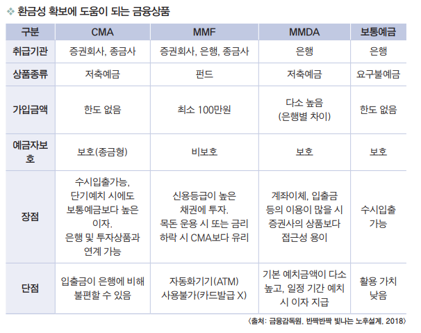 또한 은퇴기 자산관리에서는 필요한 시기에 바로 현금화할 수 있는 환금 성 확보도 중요합니다. 환금성이 높은 금융상품으로는 조건없이 수시입출금 이 가능한 보통예금이나 CMA 등 단기성 금융상품이 있습니다.