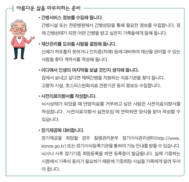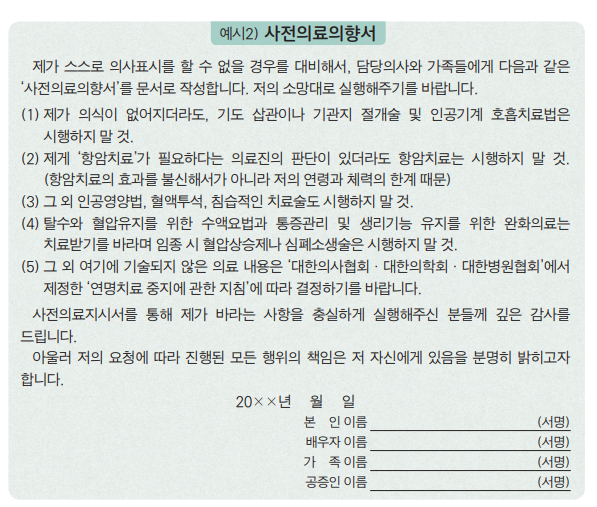 ‘품위 있는 죽음’을 맞이하기 위해 어떻게 치료받을 것인가에 대한 환자 의 권리를 주장하기 위해서는 어떻게 죽음을 맞이할 것인가에 대해 미리 고민한 후 환자 스스로가 연명치료의 시행 여부를 결정해두는 것이 바람직합니다.