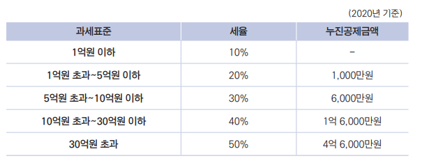 상속세와 증여세 적용 금액은 위의 표에 나와 있는 과세표준이 적용됩니다. 과세표준은 개인의 실제 상속재산(부동산, 금융자산 및 기타 재산)에서 상속이나 증여로 추정되거나 간주되는 재산을 더하고 법에 의해 정해진 일련의 공제 항목을 뺀 금액으로 실제 재산과 다소 차이가 있습니다. 하지만 최고세율이 50%에 달하기 때문에 미리 준비하는 것이 좋습니다.