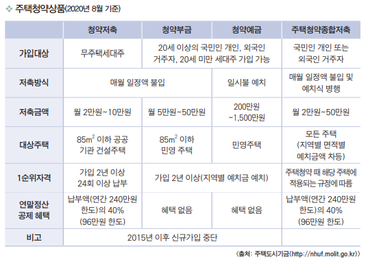 새로 짓는 아파트를 구입하기 위해서는 청약상품을 보유하고 있어야 합니다. 청 약상품에는 청약저축, 청약부금, 청약예금, 그리고 주택청약종합저축이 있는데, 이 중 청약저축, 부금, 예금은 2015년 9월 이후 신규가입이 중단되었고, 현재는 주택 청약종합저축만 판매되고 있습니다. 현재는 기존 세 개의 청약상품을 일원화하여 아파트의 규모와 지역, 자격조건 등에 제한없이 어떤 아파트이건 모두 청약할수 있 는 주택청약종합저축만 판매되고 있습니다. 주택청약상품은 종류에 상관없이 전 금융기관을 통하여 1계좌만 가입이 가능하기 때문에 2015년 9월 이전에 청약저 축·부금·예금 중 가입한 상품이 있는 경우에는 주택청약종합저축으로의 전환이 불가하며, 기존 상품을 해지하기 전에는 신규가입이 불가능합니다.