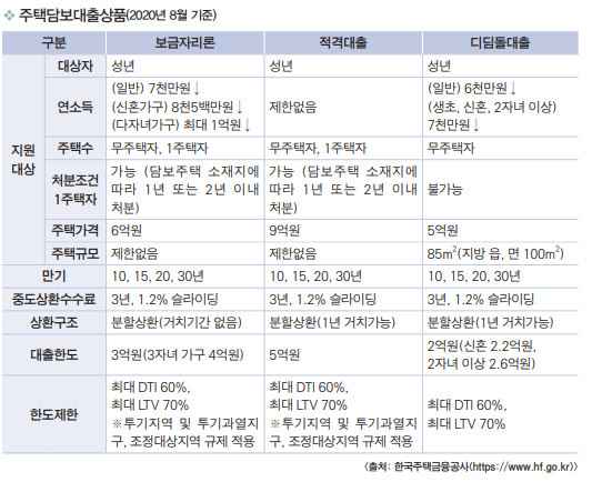 또한 한국주택금융공사에서는 기존 제2금융권(보험업권, 상호금융, 상호저축은행, 여신전문금융회사에 한함)의 변동금리 또는 만기일시상환 방식의 주택담보대출을 고정금리·분할상환 방식으로 변경할 수 있는 “더나은 보금자리론”(대환대출)을 출 시하였습니다. 이를 활용하면 가계의 부채부담을 개선하는 데 도움이 될 수 있습니다.