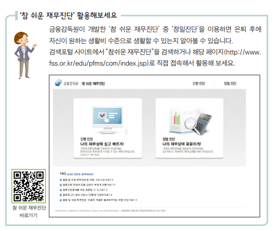 국민연금관리공단(https://csa.nps.or.kr)에서는 노후준비지원법에 따라 ‘노후준비 종합진단’을 제공하고 있으며, 이를 통해서도 자신의 노후생활 준비수준과 유형을 진단하고 재무, 건강, 여가, 대인관계 영역에서의 균형있는 노후준비를 할 수 있습 니다. 또한 해당 페이지에서 간단재무설계와 종합재무설계, 목적자금설계 등 다양 한 서비스를 함께 이용할 수 있습니다.