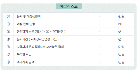 부족한 노후생활 자금을 은퇴하기 전까지 축적하기 위해 매달 얼마를 추가로 저 축해야 하는지를 계산하고 해당 금액을 운용할 적절한 금융상품, 즉 개인연금상품 이나 개인형 퇴직연금 상품을 구입하여 준비해야 합니다.