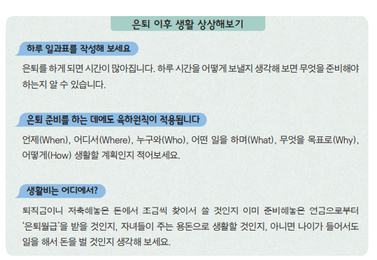 부모 부양에 대한 청소년들의 생각이 달라지는 것도 스스로 은퇴준비를 해야 하 는 이유입니다. 통계청에서 15세 이상 인구를 대상으로 조사한 결과를 보면, 가족 이 담당해야한다는 의견은 2006년 63.4%에서 2018년 26.7%로 급격하게 감소한 반면 부모 스스로 해결해야 한다는 의견은 2006년 7.8%에서 2018년 19.4%로 증 가하였습니다. 또한 가족과 정부・사회가 함께 해야 한다는 의견도 2008년 이후 꾸 준히 증가하는 추세를 보이고 있습니다.